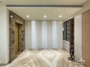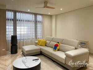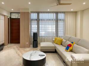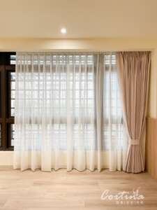 客廳設計以寬敞舒適為主,色系以奶茶色為主,無需考慮棟距問題,因而選擇清透帶點輕微朦朧感的亞麻紗,為空間增添一抹溫柔。