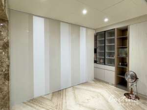 客廳與餐廳之間使用捷安片簾輕鬆區隔,以奶茶色與白色相互搭配,既實用又兼具美觀,呈現和諧的空間層次感。