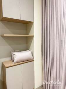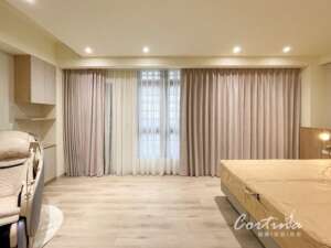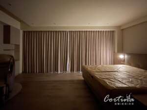 主臥室考慮到業主需要值晚班運用白天休息進行規劃,選擇百分百遮光布 選用反三摺車法+布料高度切齊地面大幅度減少漏光,淡淡的櫻花粉與白紗、房間奶茶色搭配相輔相成,整體呈現溫馨柔和的色調。